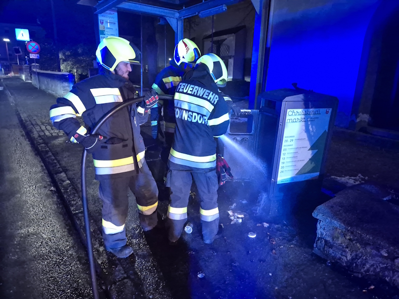 Am Samstagabend rückte die Feuerwehr zu einem brennenden Müllkübel im Bereich des Hauptplatzes aus. Mit der Schnellangriffseinrichtung des Tanklöschfahrzeuges konnte der in Flammen stehende Inhalt rasch gelöscht werden. Unter Verwendung des hydraulischen Spreizers öffnete man den Metallbehälter um an die Glutnester zu gelangen. Bevor die Feuerwehr einrücken konnte, musste diese einen weiteren Müllbehälterbrand, diesmal in unmittelbarer Nähe der HLW Fohnsdorf löschen.