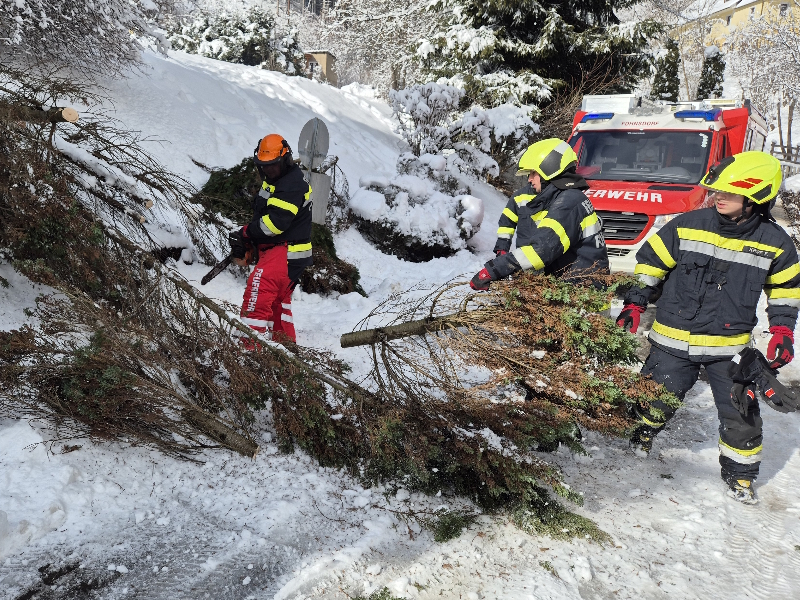 In der Mittagszeit des 21. Februars stürzten mehrere Bäume, auf Grund der Schneelast, auf eine Fahrbahn. Die mit dem Kleinrüstfahrzeug ausgerückte Mannschaft entfernten die Baumteile mit Hilfe einer Motorkettensäge. Nach Reinigung der Fahrbahn beendete die Feuerwehr nach rund 45 Minuten die Hilfeleistung.